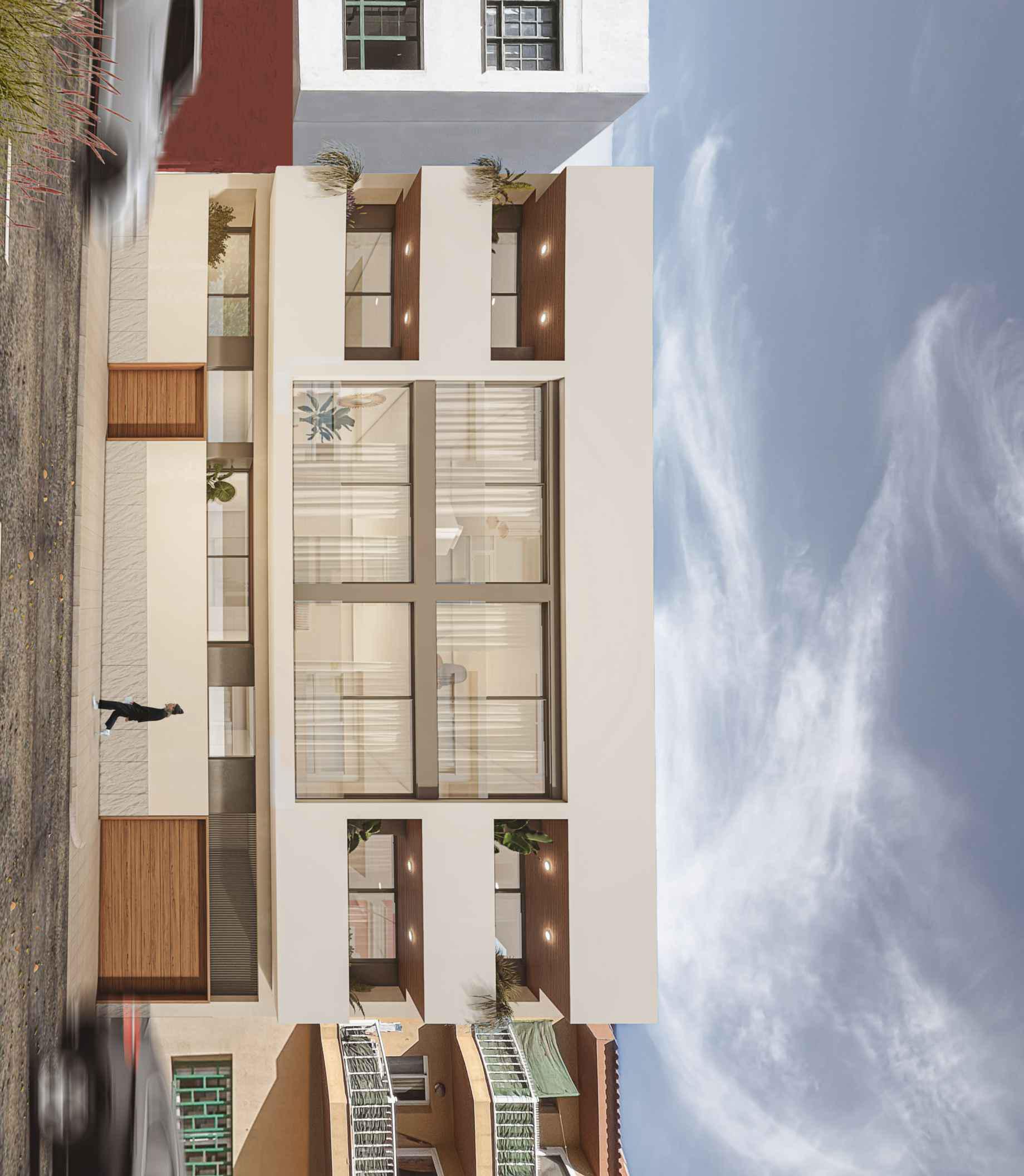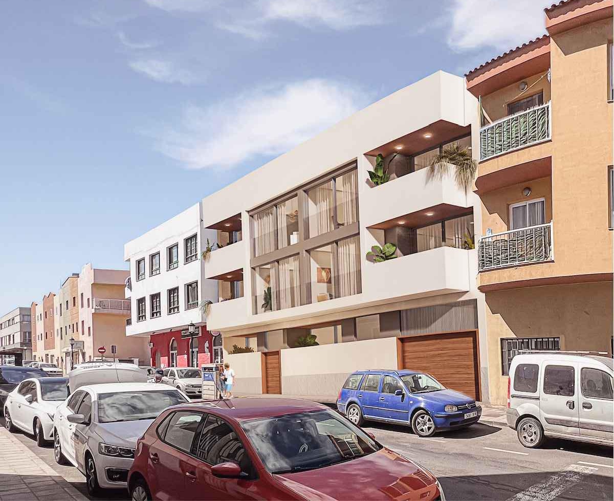 Promoción residencial de 10 viviendas de diseño contemporáneo ubicada en Calle Pizarro, Corralejo, en una zona céntrica y consolidada, a pocos minutos a pie de la playa, comercios, restaurantes y todos los servicios.