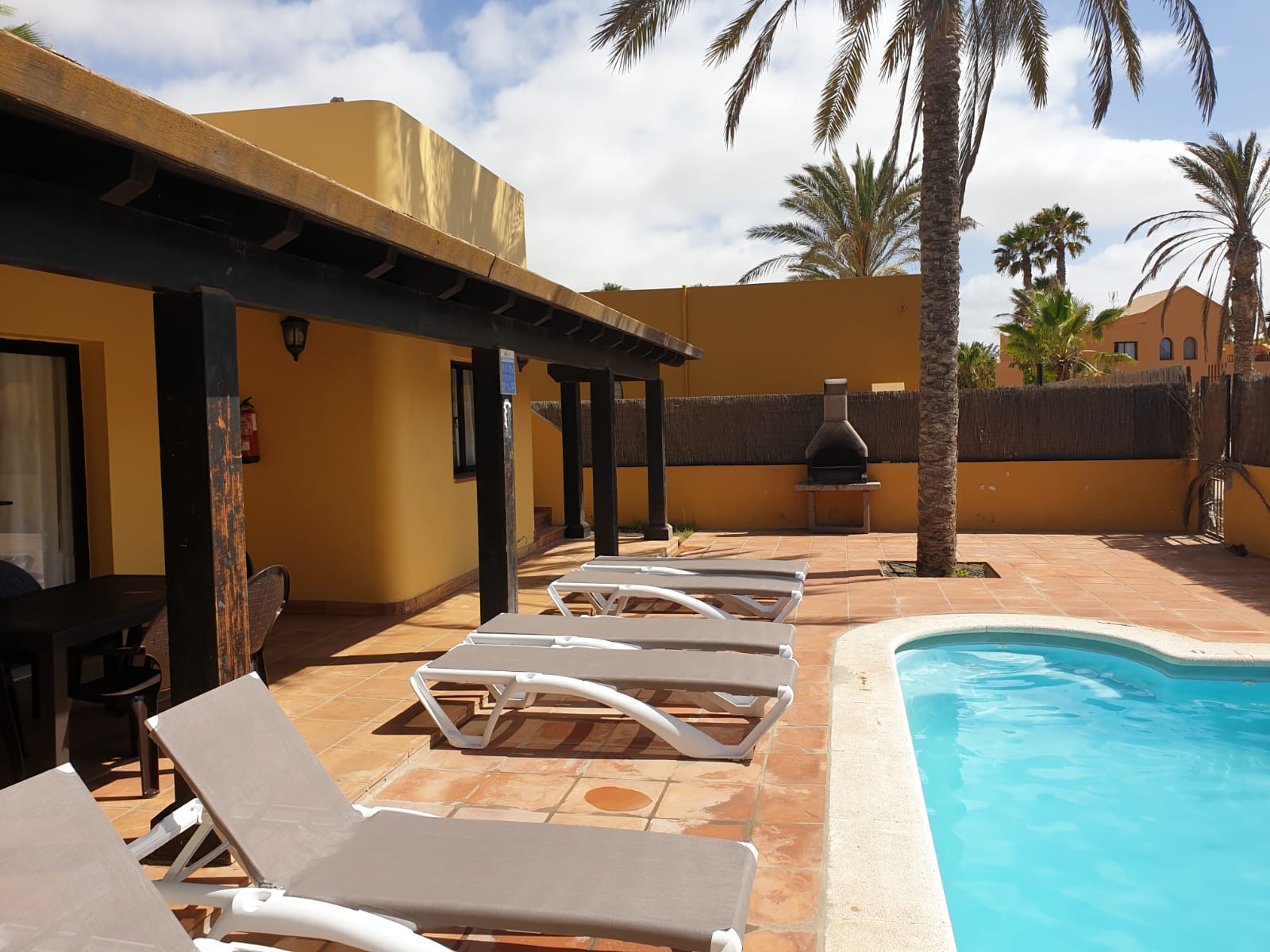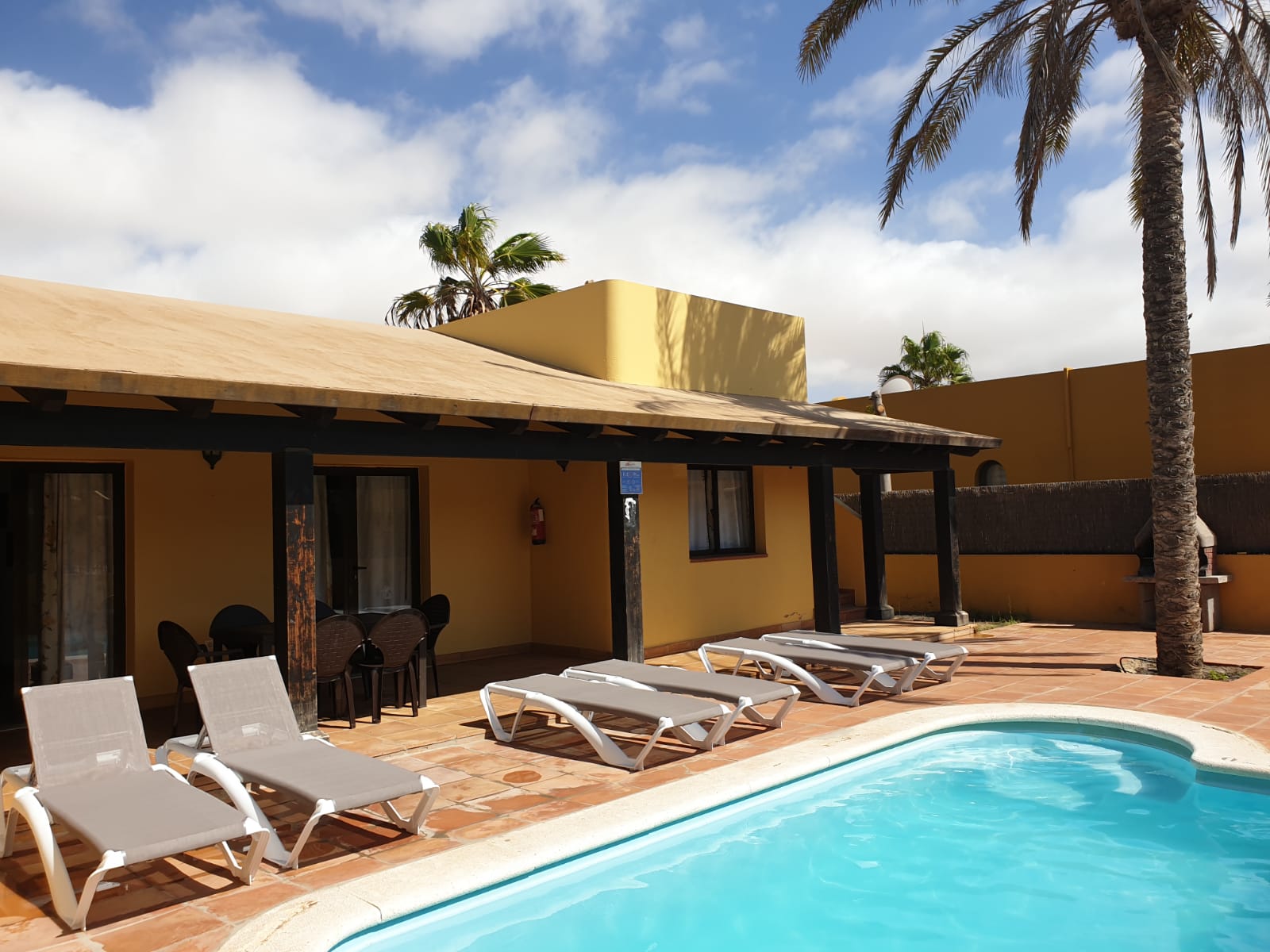 Este inmueble consta de 500m2 de terreno, de los cuales 115m2 pertenecen al edificio de la vivienda. Ésta se compone de 3 dormitorios y 2 baños, salón, comedor y cocina, todas estas estancias caracterizadas por su gran amplitud y bondades lumínicas. Por otro lado, incluye una maravillosa terraza cubierta por una pérgola de una extensión de 30m2 que incluye justo en frente una piscina privada, de uso y disfrute exclusivo para sus propietarios, además de zonas ajardinadas que rodean la estructura en su práctica totalidad. Se vende amueblado como muestran las fotos y no es aplicable en este caso ningún pago de comunidad.