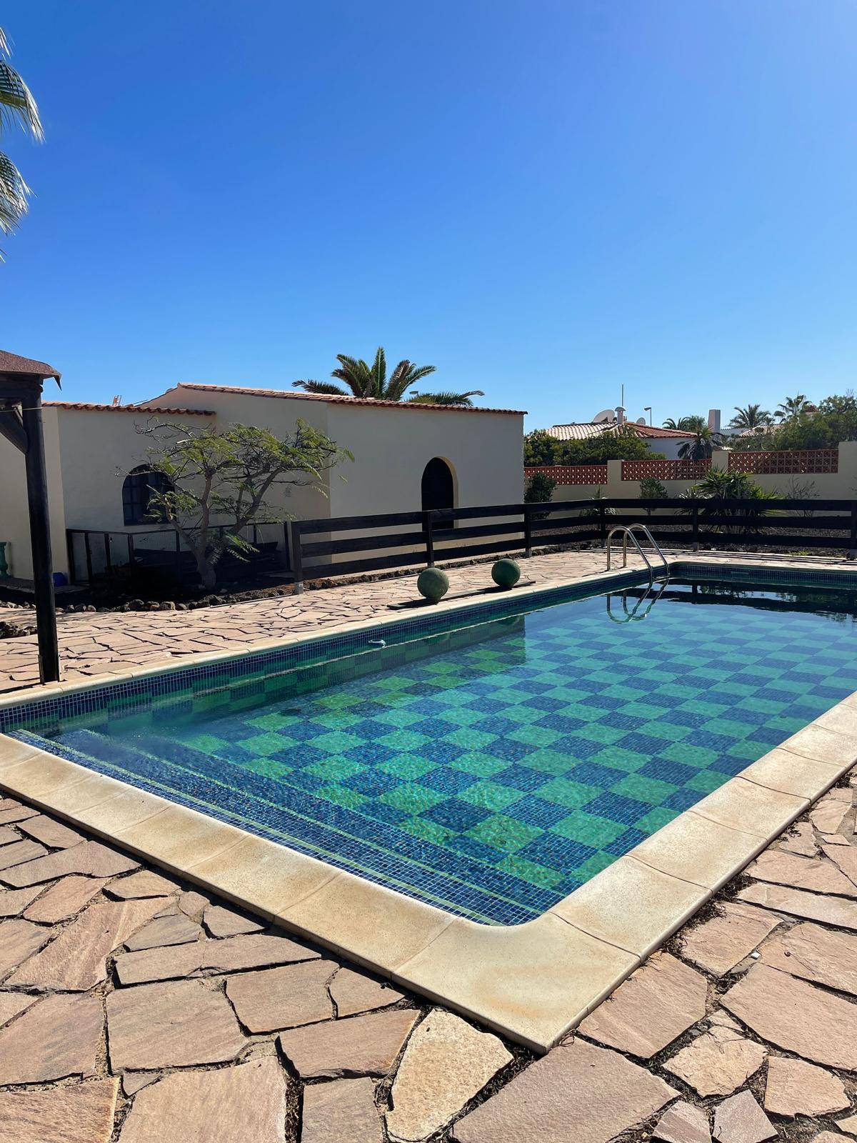 Villa independiente en Parque Holandés, término municipal de La Oliva. Parcela de 1500 metros cuadrados y 250 metros construidos. Dispone de 4 dormitorios (uno de ellos en suite), dos baños, comedor independiente, amplio salón, porche, terraza, trastero, piscina 10×4m y jardín de grandes dimensiones.