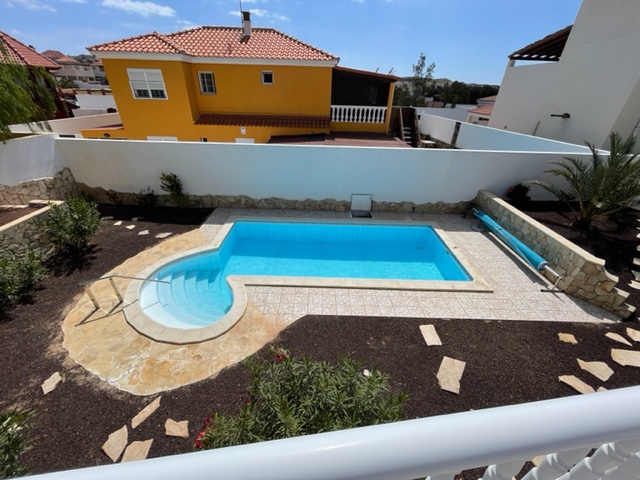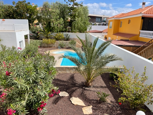 La vivienda consta de 3 dormitorios con armarios, 2 baños, cocina, amplio salón, varias terrazas con una fantástica piscina privada ideal para disfrutar el clima tropical de la isla, garaje, trastero y un bonito jardín.