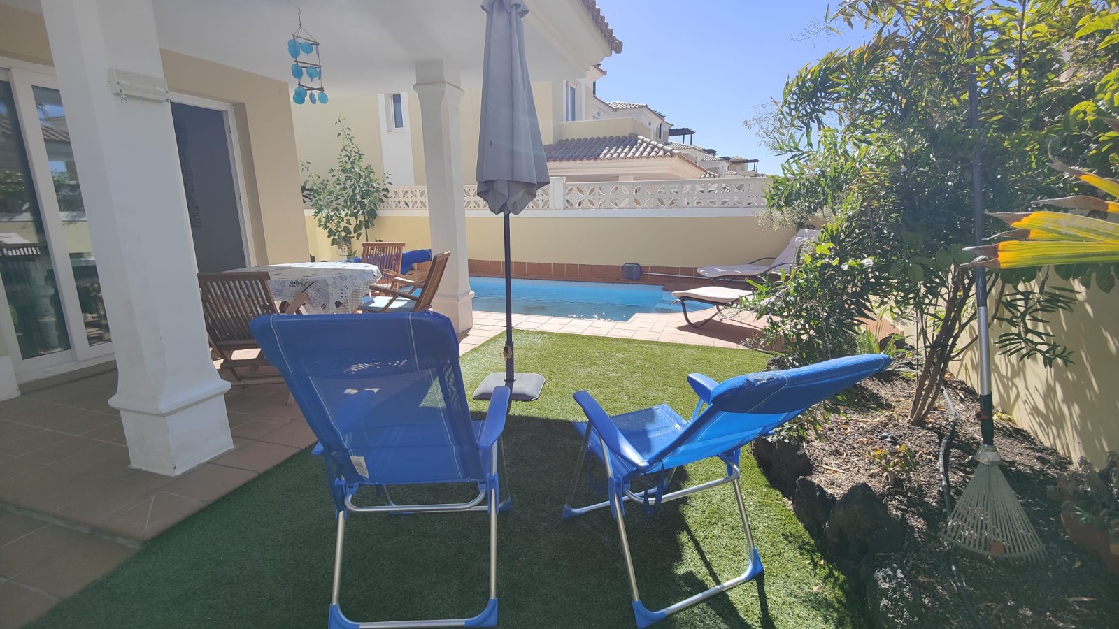 El edificio de la vivienda abarca una superficie de 180m2 y se distribuye en 3 dormitorios, 3 baños (uno de ellos incorporado a la habitación principal), cocina (totalmente equipada con cuarto de la lavadora y baño), salón-comedor y 2 terrazas. Una de las terrazas se localiza en la planta baja a la entrada de la vivienda y está techada por un lado para albergar sillas y mesas, mientras que en el lado descubierto se encuentra la piscina de uso privado y todo ello rodeado de zonas ajardinadas en muy buen estado de conservación. La otra terraza en lo alto a modo azotea está protegida por una pérgola de madera casi en su totalidad y cuenta con unas vistas incomparables del paisaje que lo rodea. Dispone de plaza de aparcamiento fuera de la propiedad y se vende totalmente amueblada y equipada.