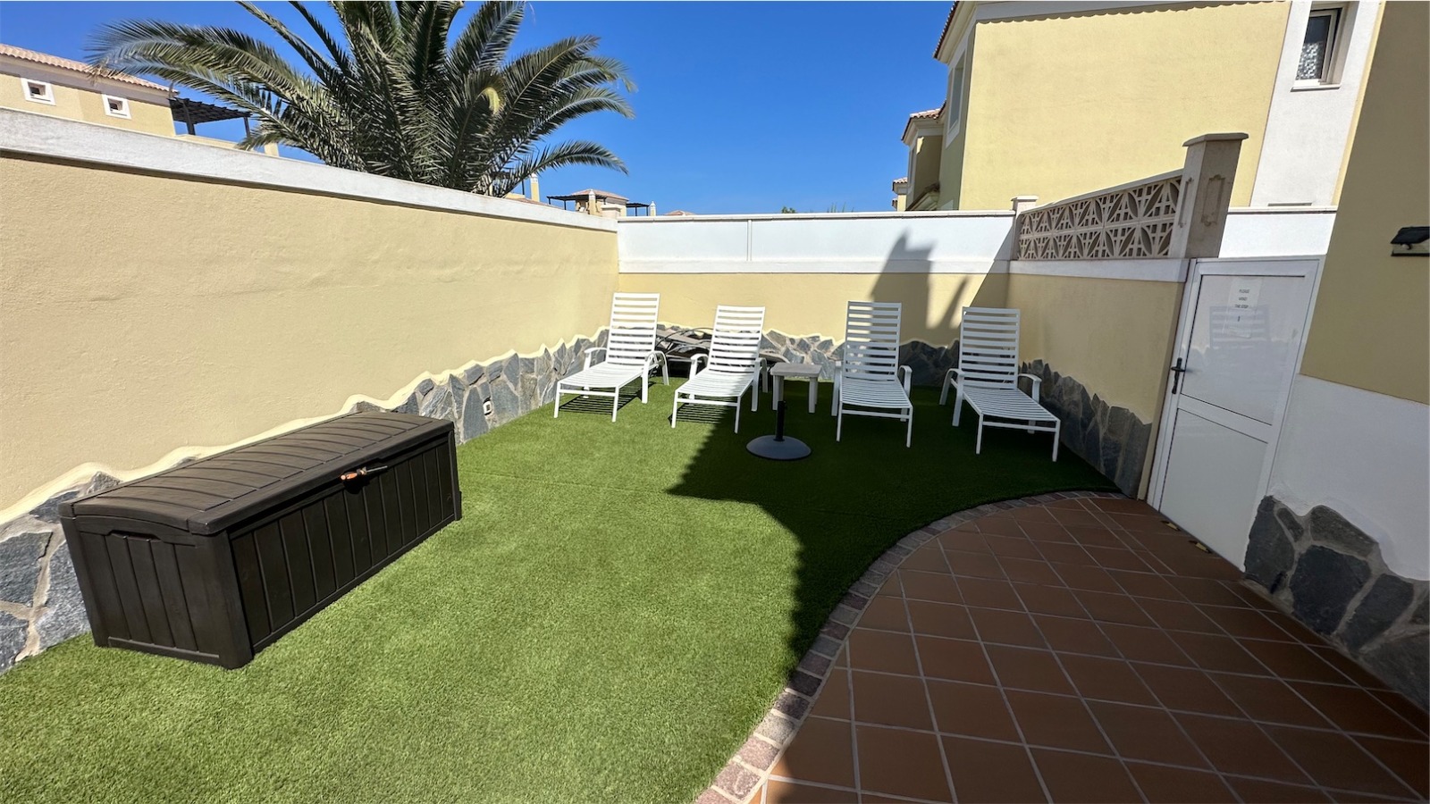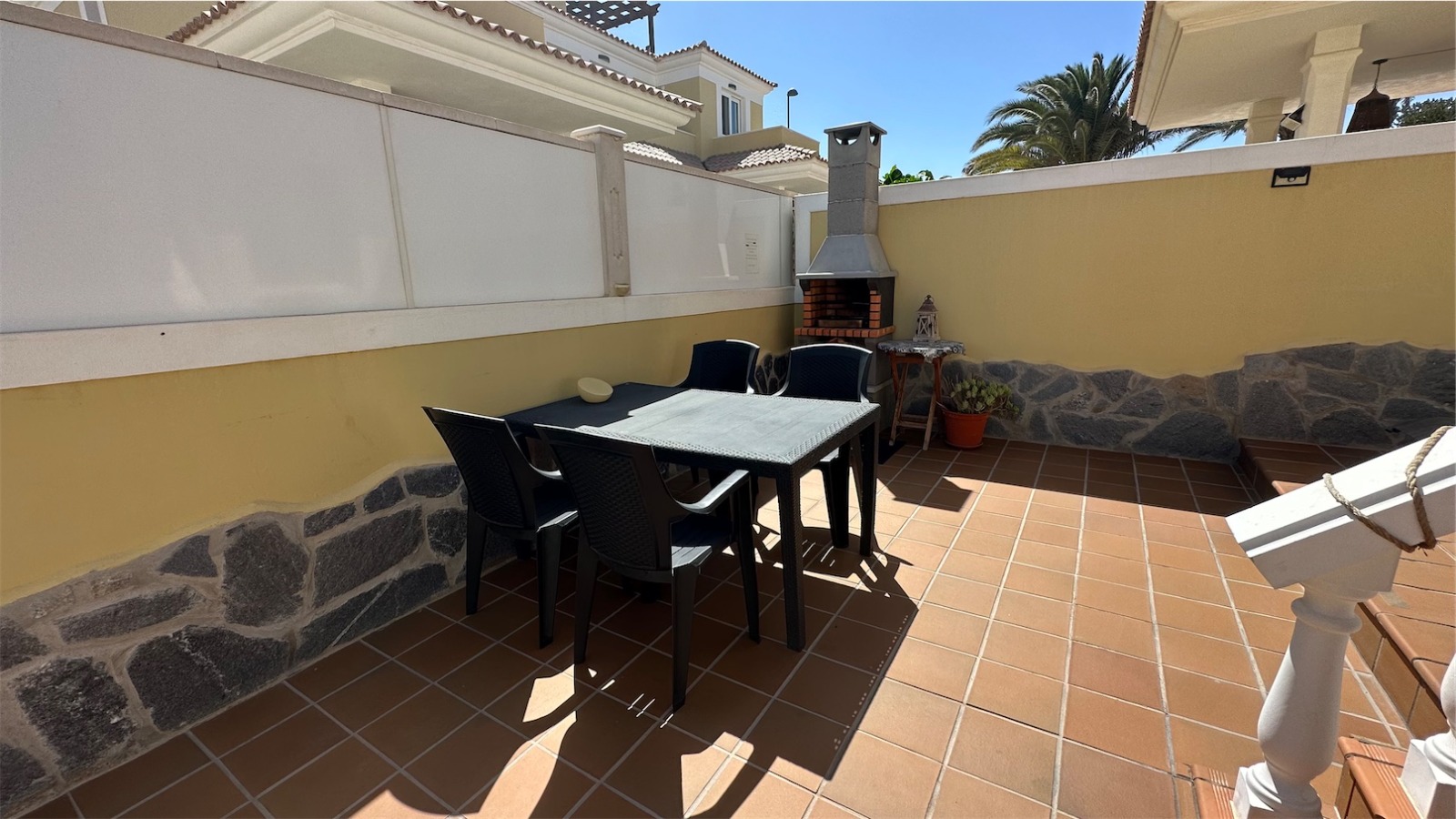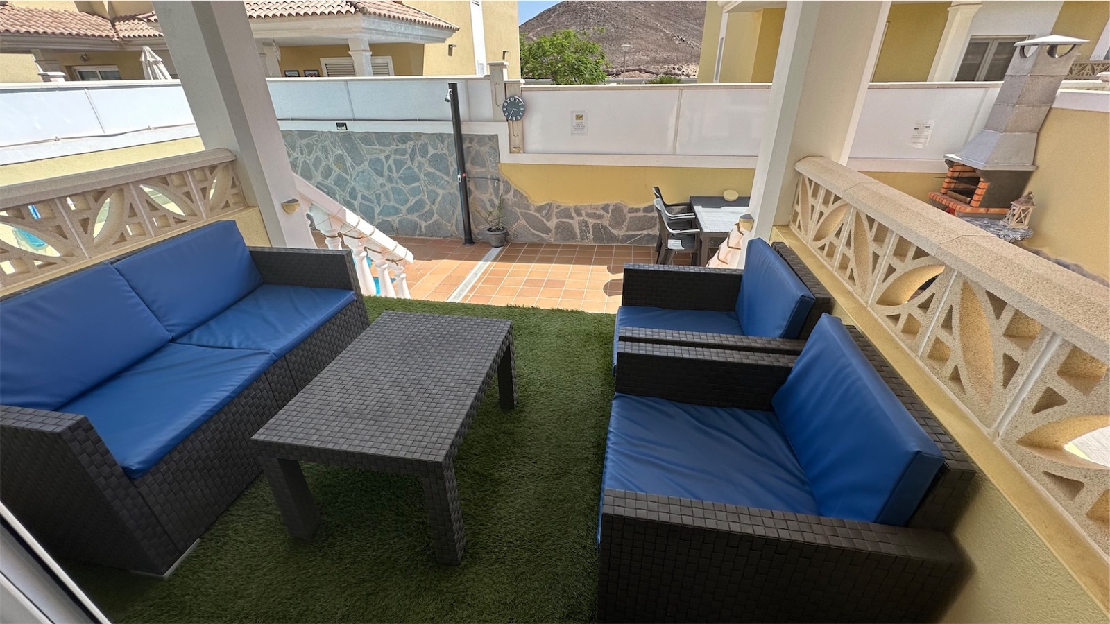 Esta propiedad más grande respecto a la media de las propiedades en el mismo complejo cuenta con tres plantas más una terraza en la azotea con impresionantes vistas, un jardín envolvente con piscina privada, jacuzzi, zona de barbacoa y aparcamiento privado para dos coches.