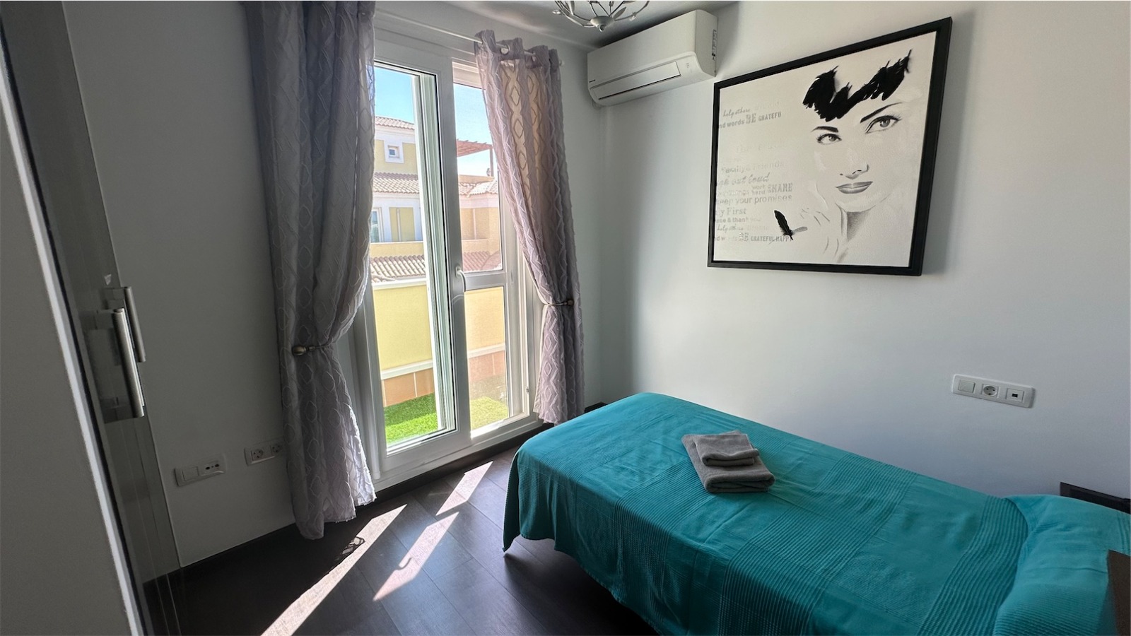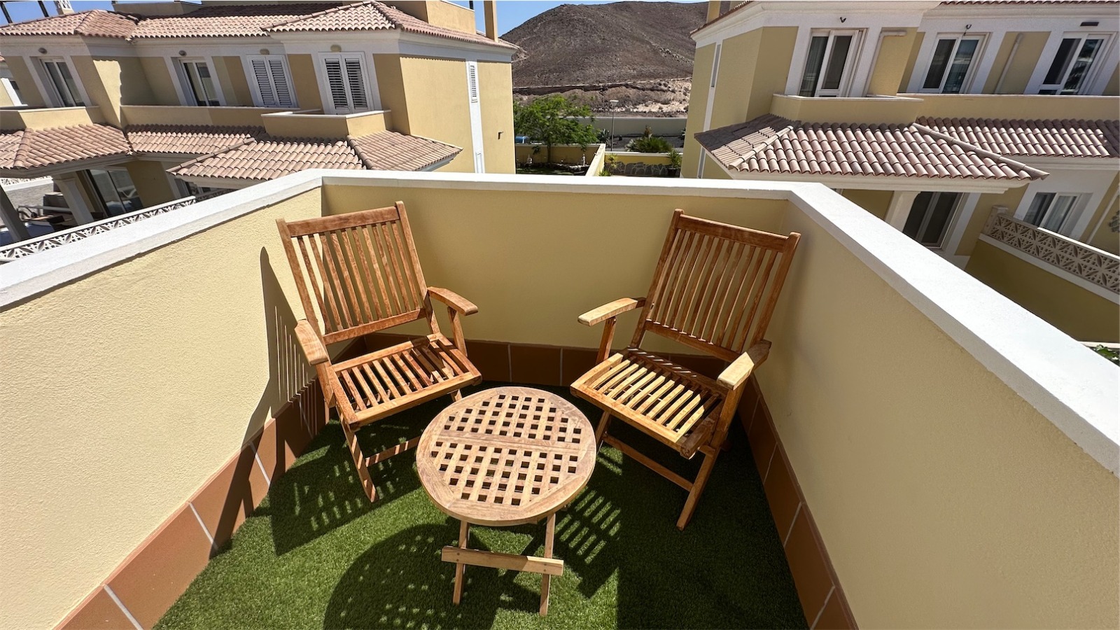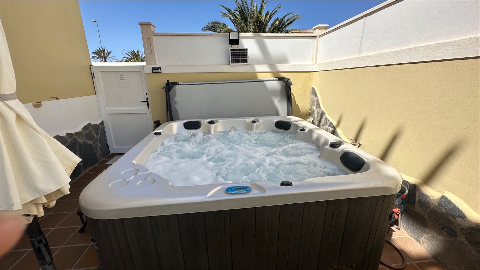 Esta propiedad más grande respecto a la media de las propiedades en el mismo complejo cuenta con tres plantas más una terraza en la azotea con impresionantes vistas, un jardín envolvente con piscina privada, jacuzzi, zona de barbacoa y aparcamiento privado para dos coches.